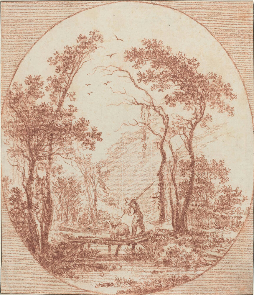 A Farmer and a Sheep Crossing a Rustic Bridge