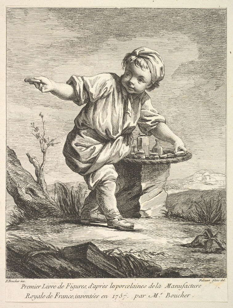 Frontispiece with litte boy holding a basket, from Premier Livre de Figures d'après les porcelaines de la Manufacture Royale de France, inventées en 1757, par Mr. Boucher (First Book of Figures after porcelains from the Manufacture Royale de France, devised in 1757, by Mr. Boucher)
