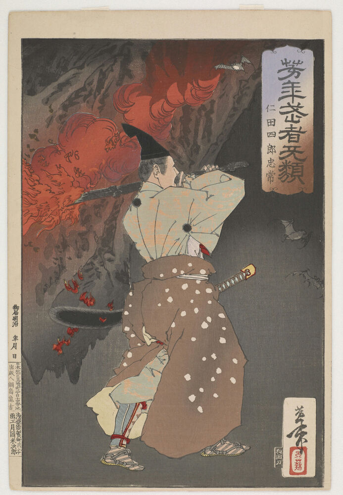 Nitta Shiro Tadatsune entering a cave with a torch, from the series Yoshitoshi's Courageous Warriors