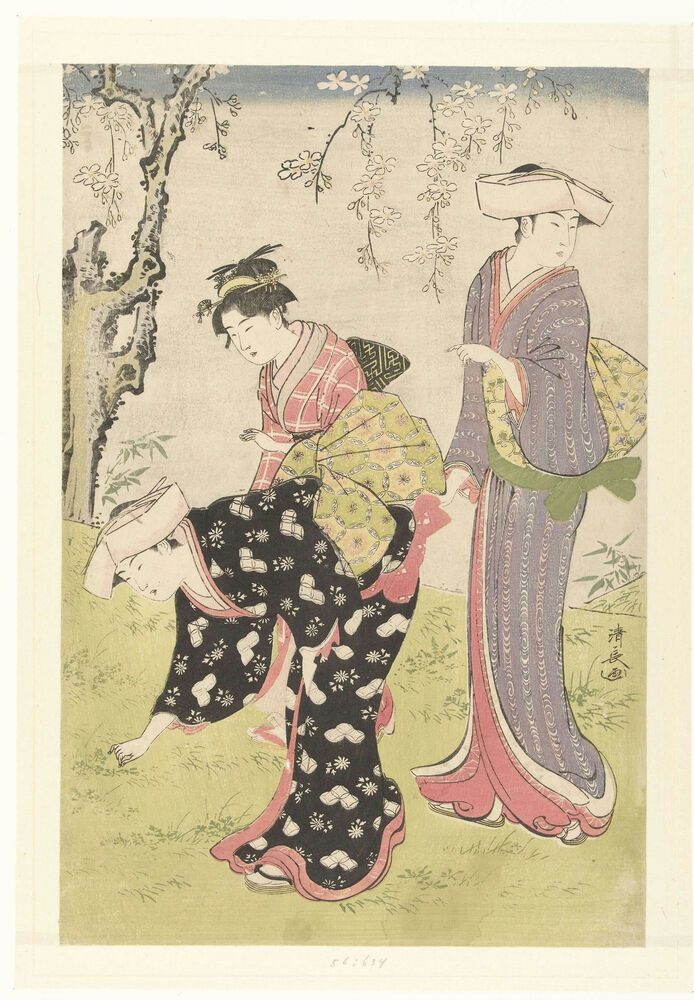 Twee vrouwen en een meisje onder een bloesemende kersenboom