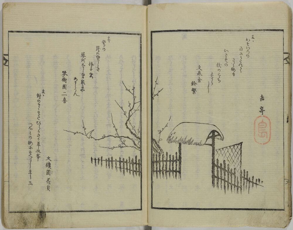 Five kyoka books bound together: part 1, Edo meibutsu hyakudai kyōka-shū; part 2, Kyōka Yoshiwaragata shiki saiken; part 3, Kyōka jittetsu shū; part 4, (Fukagawa) Hitomaro jinja hōnō gakumen kyōka shū; part 5, Kyōka sanjū-rokkasen