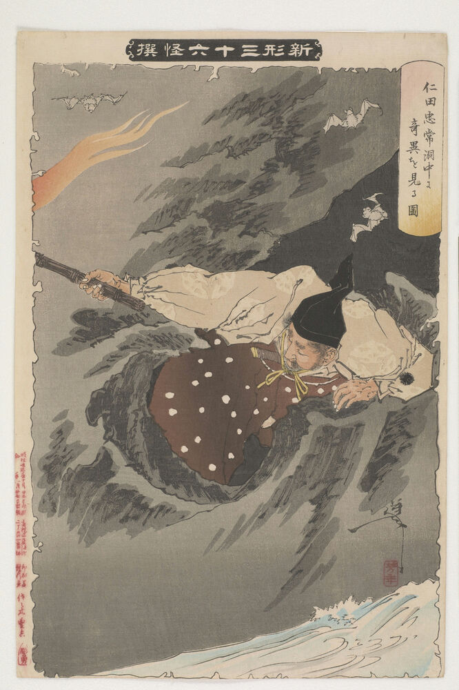 Nitta Tadatsune seeing an apparition in a cave, from the series New Forms of Thirty-six Ghosts