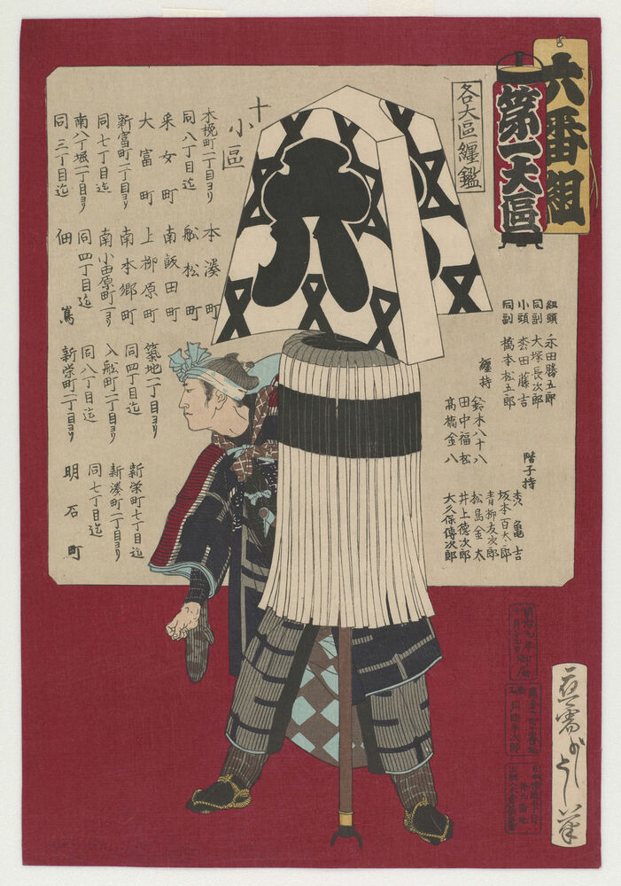 A fireman, looking left, holding the standard for district six, from the series Firemen's Standards of all Great Districts