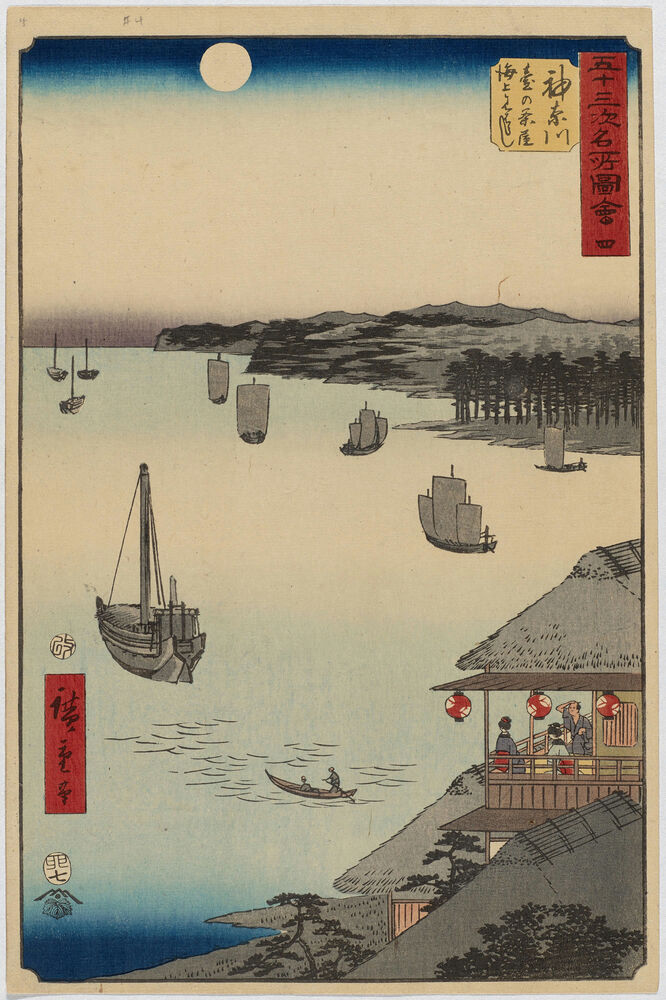 No. 4 Kanagawa: View over the Sea from the Teahouses on the Embankment from the series Famous Sights of the Fifty-Three Stations (Gojusan tsugi meisho zue)