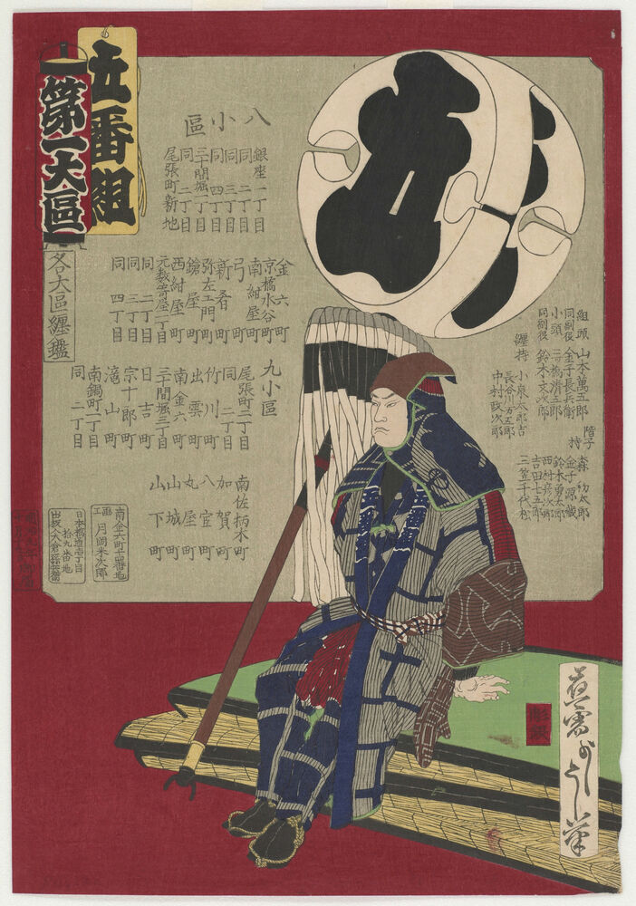 A seated fireman holding the standard for district five, from the series Firemen's Standards of all Great Districts