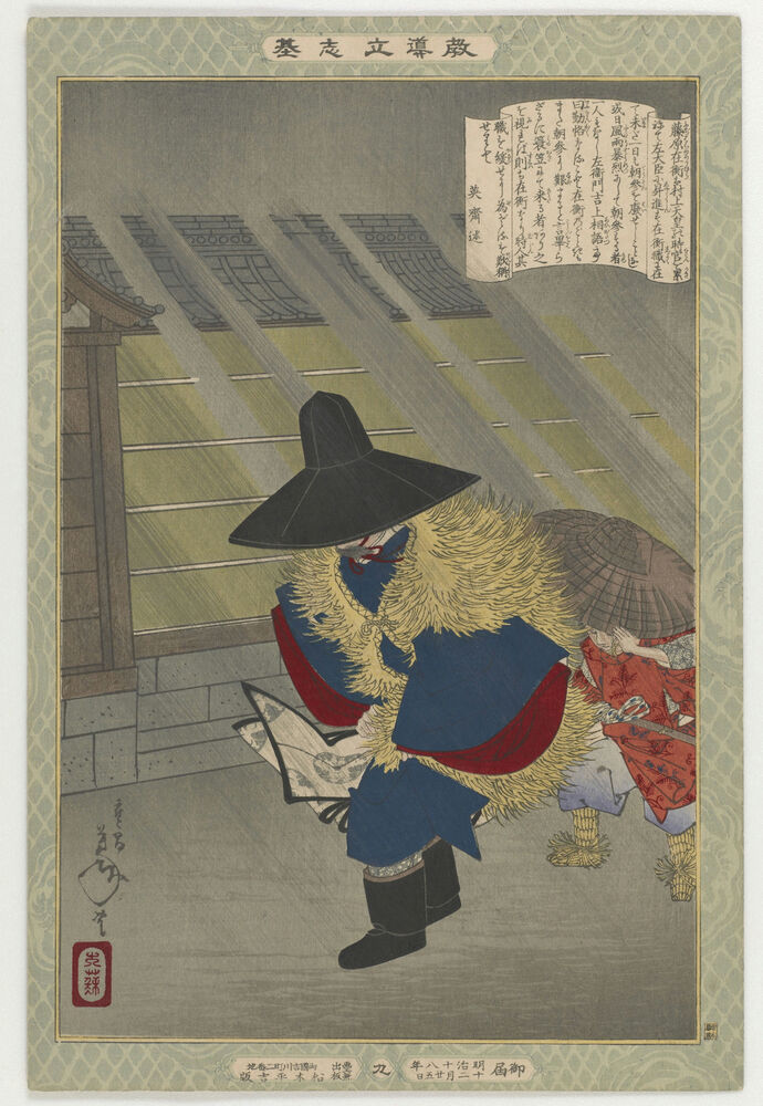 Fujiwara no Arihira, Minister of the State, on his way to his office in a heavy rainstorm, from the series Instructive models of lofty ambition