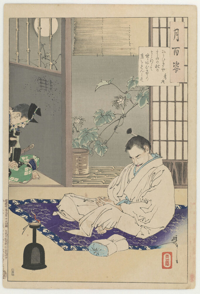 Did I ever imagine that/as the clouds of the hight autumn sky cleared/I would view the moon through a bamboo lattice window - Hidetsugu, from the series One Hundred Aspects of the Moon