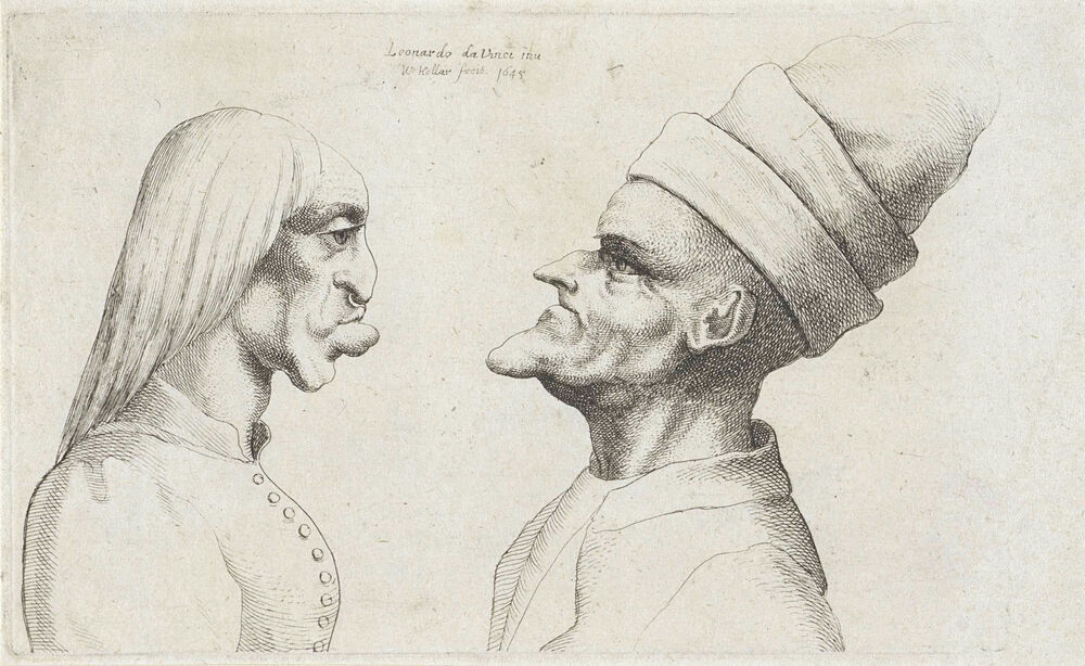 Misvormde koppen van een vrouw met stijl haar en man met dubbel gerande muts