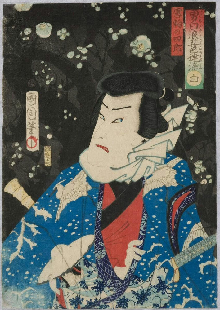 A Kabuki actor as the bandit Shiro in falling snow, from the play Five Courageous Bandits in Five Colors, white