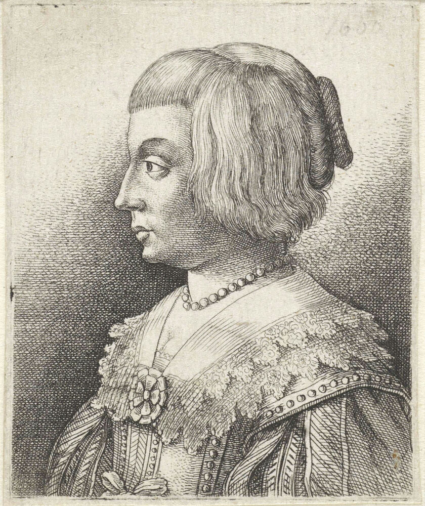 Portret van een jonge vrouw met kraag en rozet