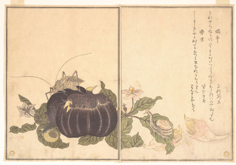 『画本虫撰』「蝸牛」「轡虫」|Land Snail (Katatsumuri); Giant Katydid (Kutsuwamushi), from the Picture Book of Crawling Creatures (Ehon mushi erami)