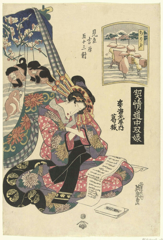Courtisane Katsuragi uit het Sugata Ebiya huis, vergeleken met het station Chirifu.