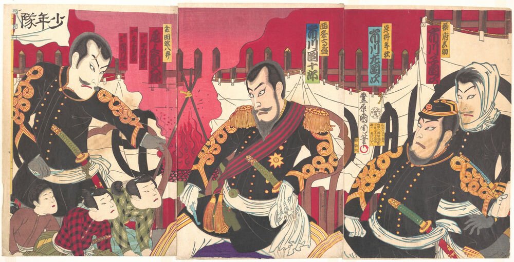 「摂府真助」「市川子團次」「岸野年秋 市川左團次」 「西条高盛 市川團十郎」 「倉田進八郎 尾上菊五郎」「正太郎 中村仲太郎」「孫市 尾上菊之介」「徳丸 市川幸作」西南雲晴朝東風|Ichikawa Kodanji as Seppu Shinsuke, Ichikawa Sadanji as Kishino Toshiaki, Ichikawa Danjūrō as Saijō Takamori, Onoe Kikugorō as Kurata Shinpachirō, Nakamura Chūtarō as Shōtarō, Onoe Kikunosuke as Magoichi, and Ichikawa Kōsaku as Tokumaru in the play Okige no kumo harau asa gochi