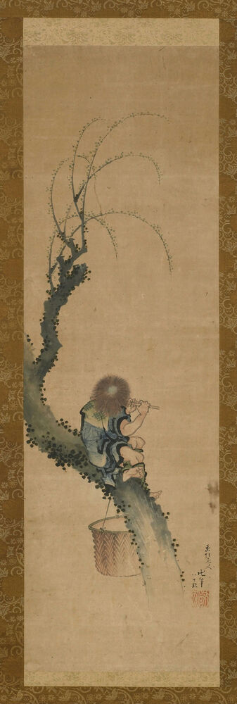 Boy seated on a tree trunk playing a flute