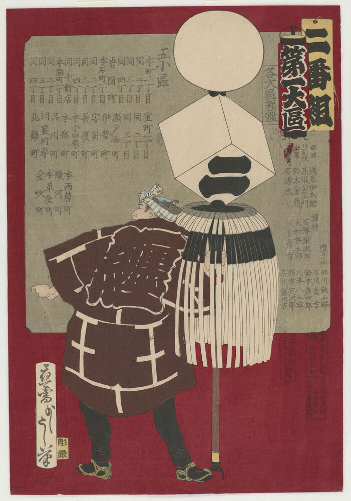 Fireman seen from the back, holding the standard for district two, from the series Firemen's Standards of all Great Districts