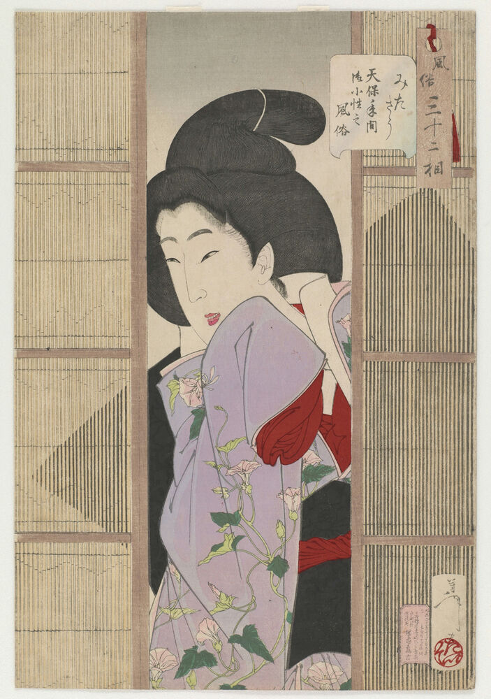 Looking inquisitive: the appearance of a maid of the Temp era (1830-1844), from the series Thirty-two Aspects of Customs and Manners