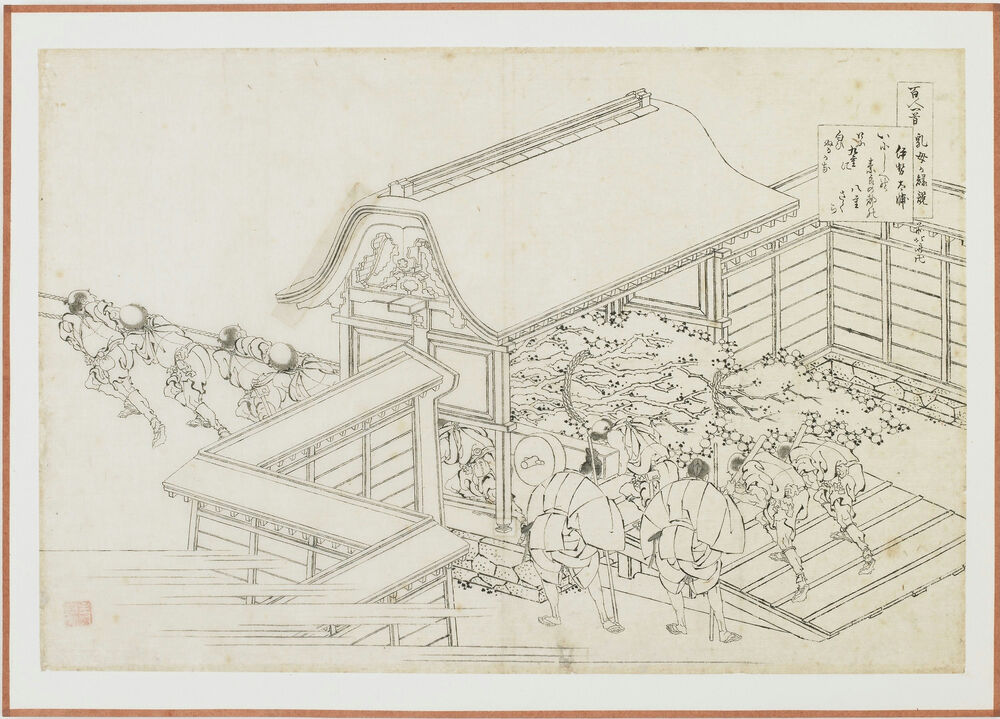 Workmen hauling tree through gate from the series, Hyakunin Isshu Ubaga Etoki