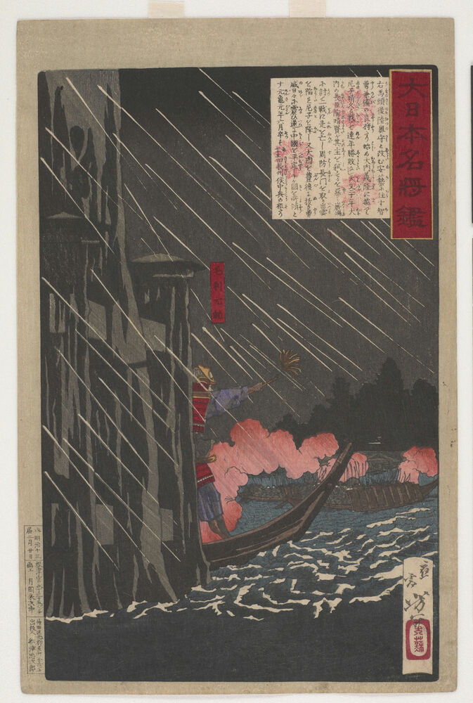 Mori Motonari attacking Sue Harukata at Itsukushima, from the series Mirror of Famous Generals of Japan