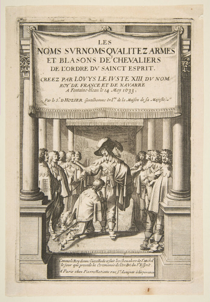 Frontispiece to Pierre d'Hozier's "Les noms surnoms qualitez armes et blasons des chevaliers de l'Ordre du Sainct Esprit" with Louis XIII dubbing a nobleman kneeling before him, in the presence of several other noblemen