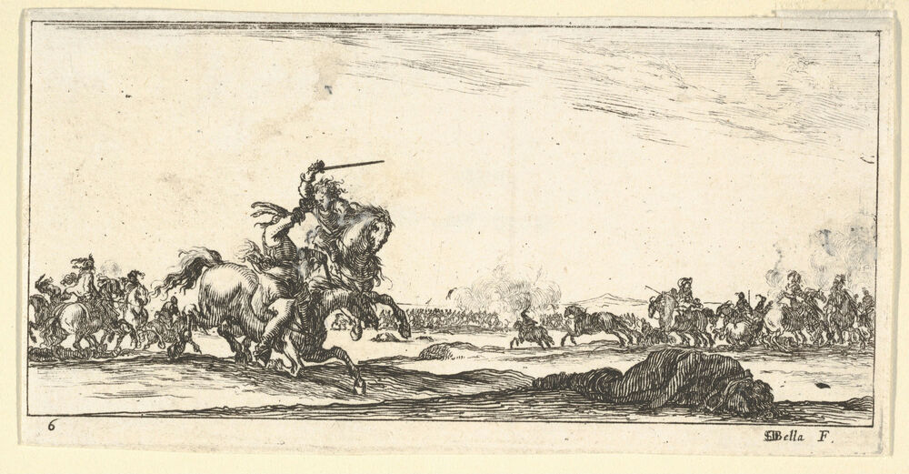 Plate 6: a skirmish between two horsemen to left, a dead man on the ground to the right, combat in the background, from 'Troops, cannons, and attacks on towns' (Dessins de quelques conduites de troupes, canons, et ataques de villes)
