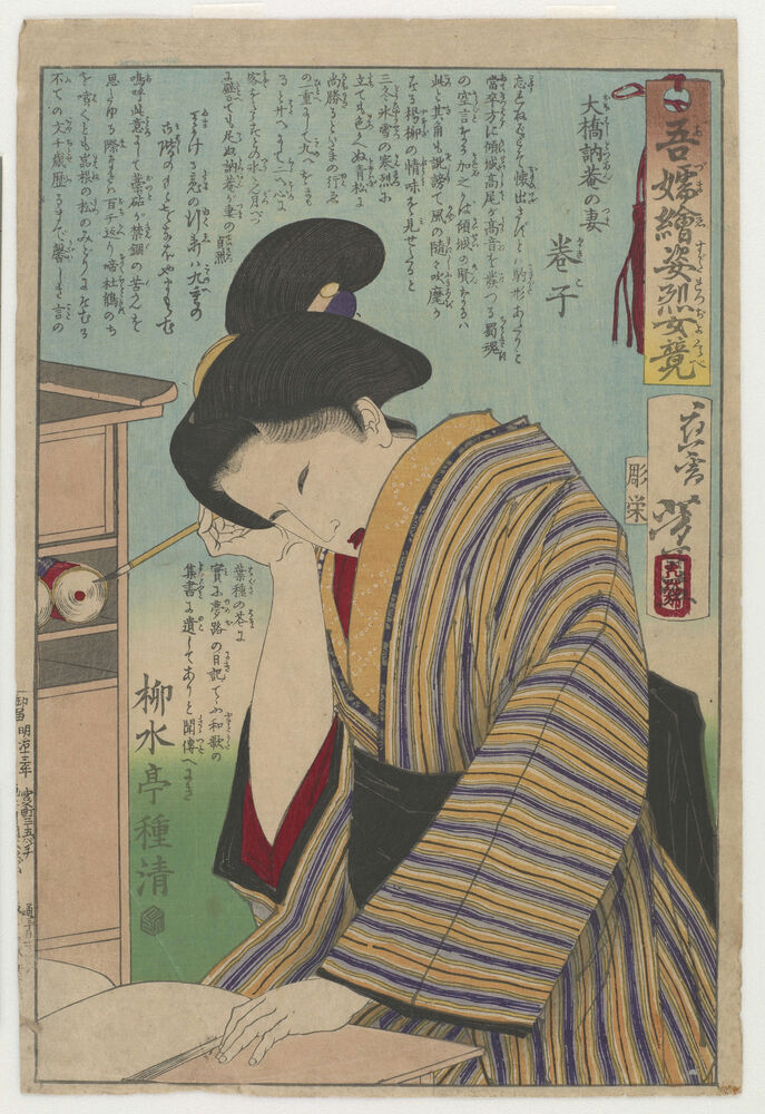 Makiko, the concubine of Ohashi Shoan, seated at a desk, from the series Eastern Pictures of Heroic Women Compared