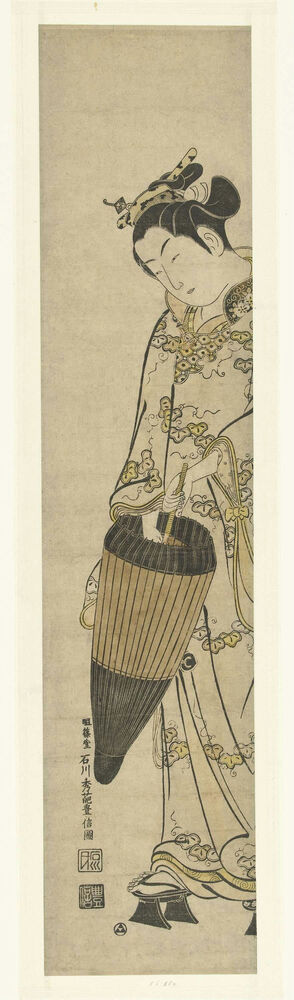 Vrouw in regenjas met gestileerd vlinder patroon, een naar benenden gerichte paraplu openend.