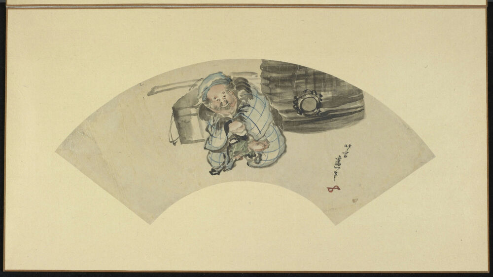A fat old man sitting beside a large bell