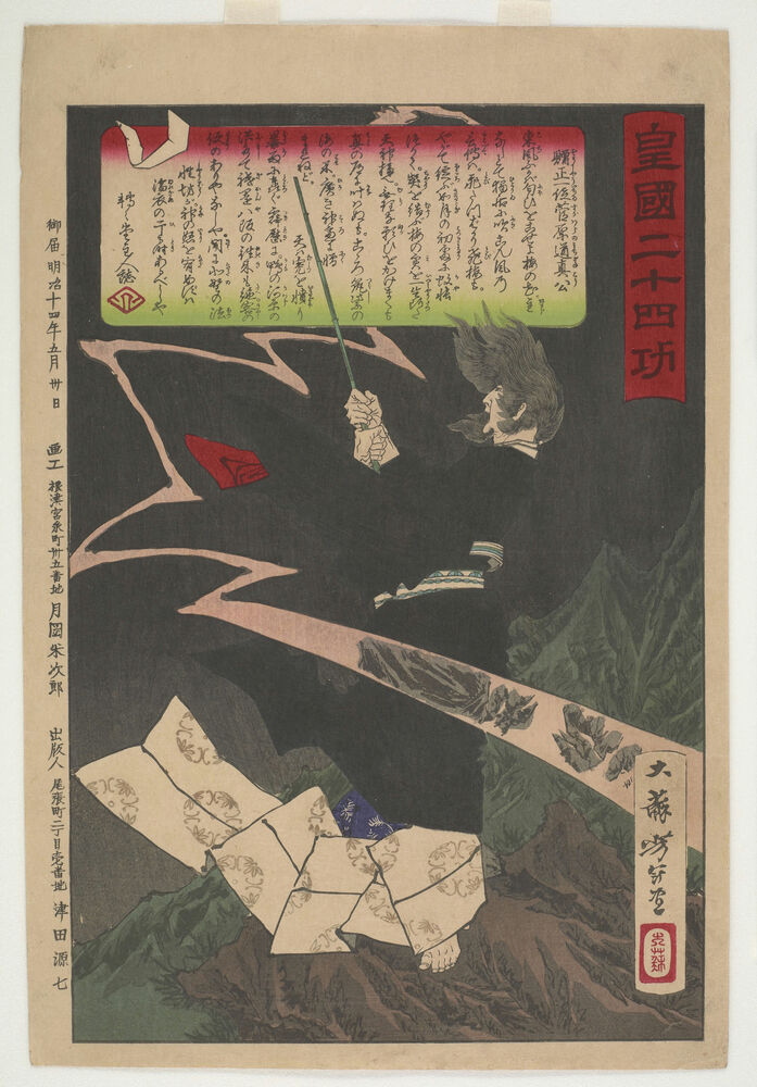 Sugawara no Michizane praying for a storm on Mt. Tempai, from the series Twenty-four Accomplishments in Imperial Japan