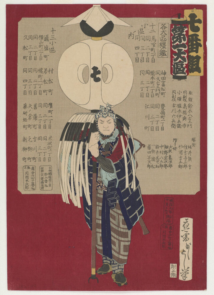 Frontal view of a fireman holding the standard for district seven, from the series Firemen's Standards of all Great Districts
