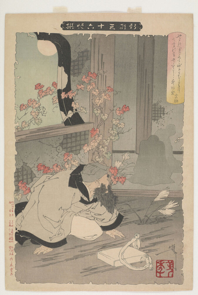 The ever-reflecting water is frozen and covered with ice, it does not mirror the evening moon in the sky - Sogi, from the series New Forms of Thirty-six Ghosts