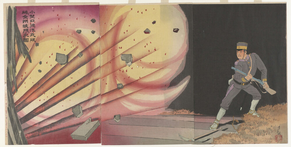 Private Onoguchi blasting the gate of Kinshu Castle