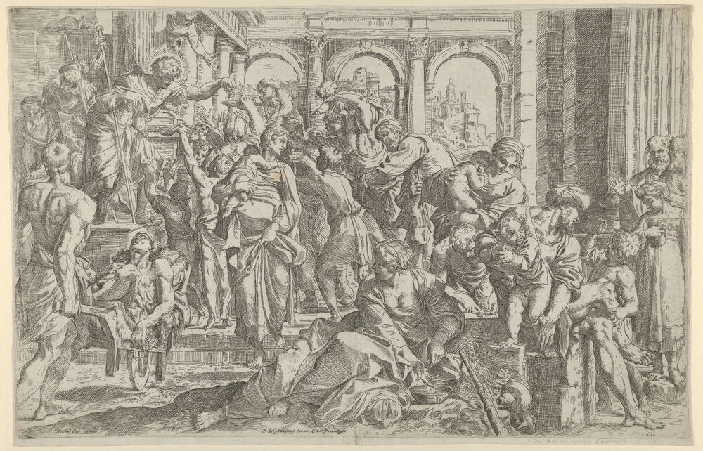Saint Roch at left distributing alms to a group of people gathered around him, after Annibale Caracci