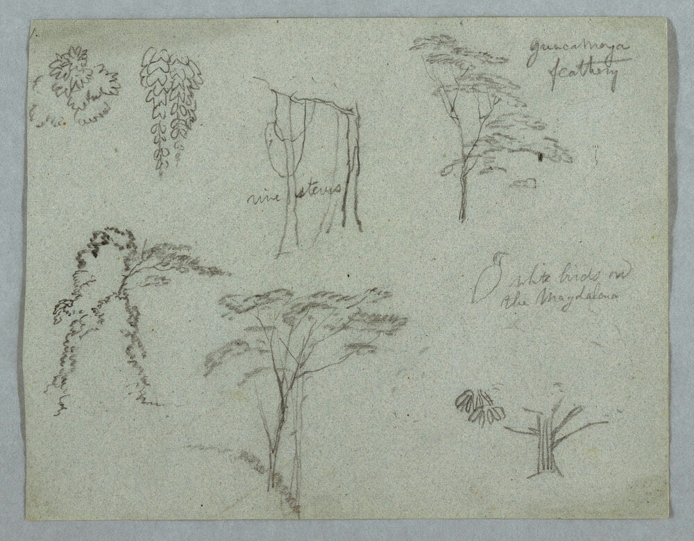 Sketches from the Rio Magdalena, Colombia: Leaf Boughs, Vine Stems, Guacamaya Tree Top, Bush and Tree Group, White Bird , and a Plant Detail