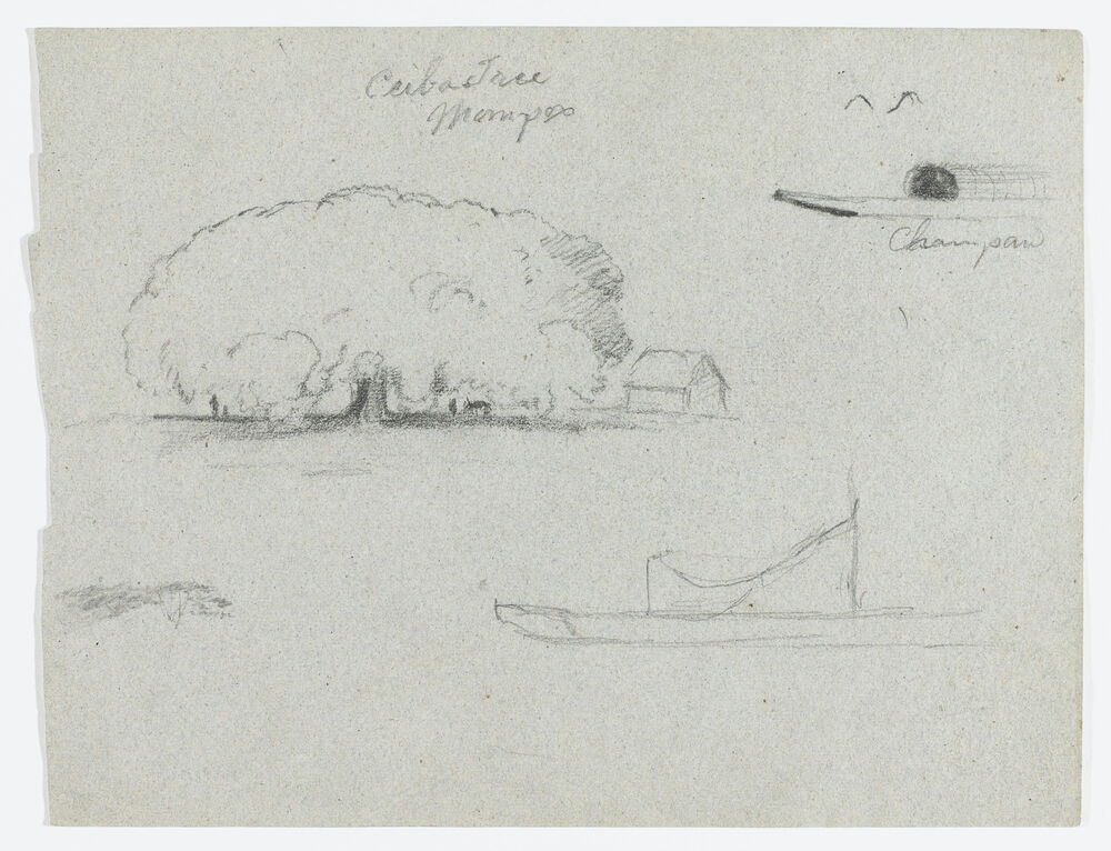 Ceiba Tree at Mompos, Champan Canoe, Trees, and a Partial Boat, Rio Magdelena, Colombia