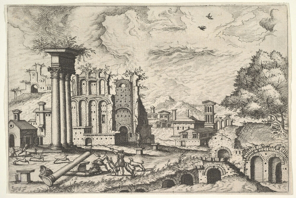 View of the Roman Forum, looking toward the Palatine Hill, from the series 'The Small book of Roman ruins and buildings' (Operum antiquorum romanorum)