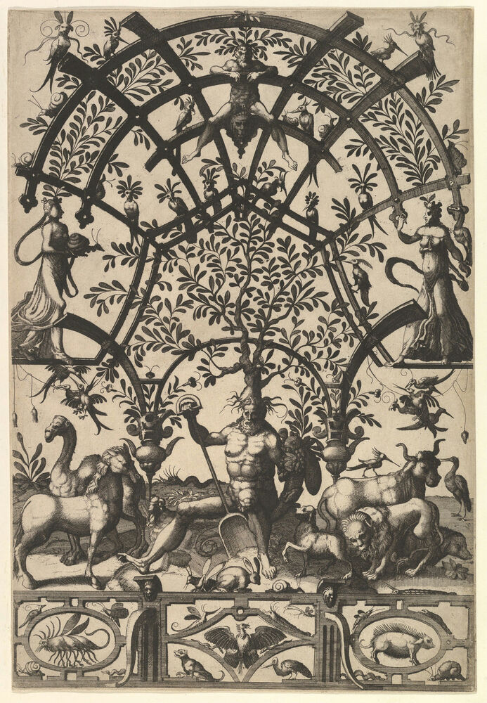 Personification of Earth, with Spade and Horn, Supporting a Tree and Lattice on His Head, A Frieze underneath from Veelderleij niewe inventien van antijckesche sepultueren diemen nou zeere ghebruijkende is met noch zeer fraeije grotissen en compertimenten zeer beqwame voer beeltsniders antijcksniders schilders en all constenaers...Libro Secundo