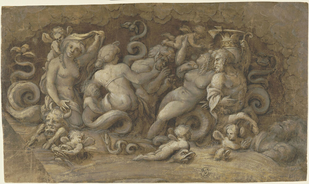 Nereidi, Tritoni e putti alati sopra delfini