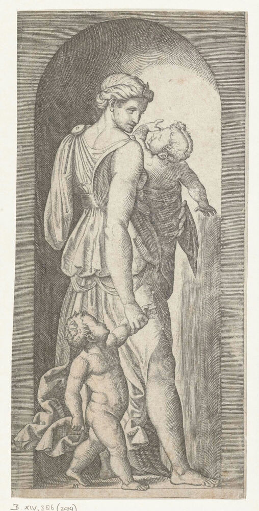 Vrouw als personificatie van Liefde (Caritas) met twee kinderen staand in nis