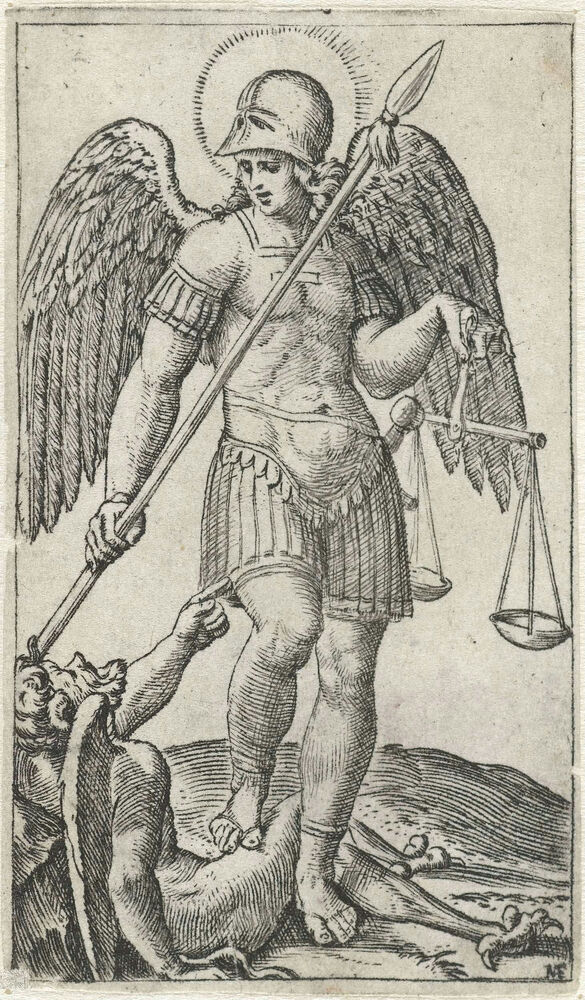 Aartsengel Michaël staand op duivel met speer en weegschaal