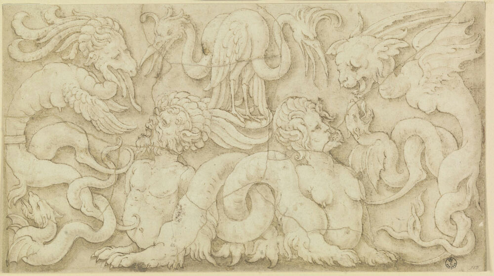 Fregio con tritoni, cicogne e due coppie di animali mostruosi