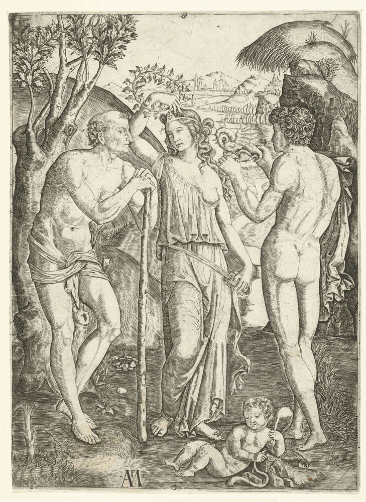 Jonge vrouw met bladerkrans staand tussen oude man leunend op stok en jonge man met draak en kind