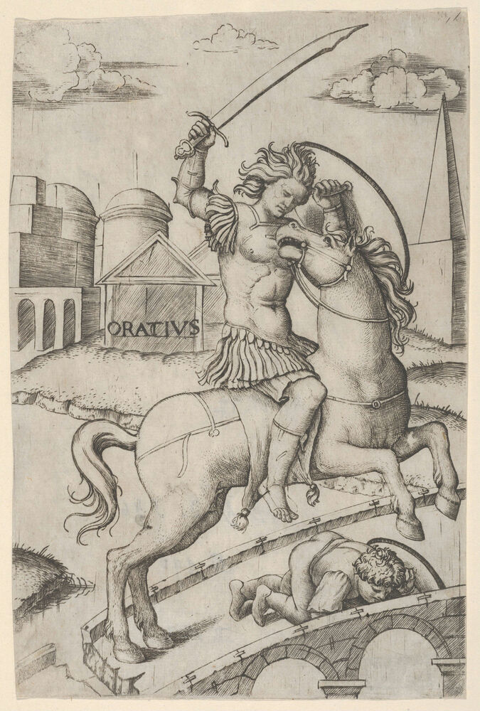 Horatius Cocles on horseback, trampling a fallen soldier