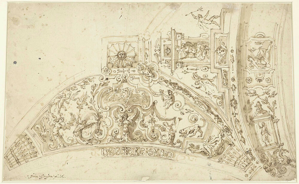 Ontwerp voor de beschildering van een gewelf met figuren, putti, dieren en ornamenten