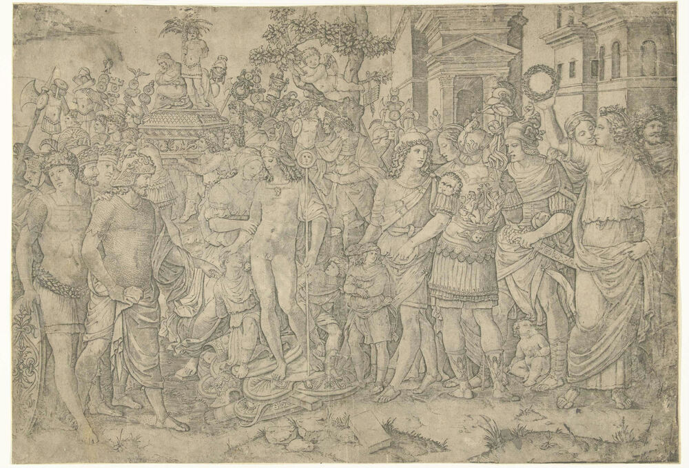Triomftocht van Romeinse keizer met soldaten en buitgemaakte wapenrustingen