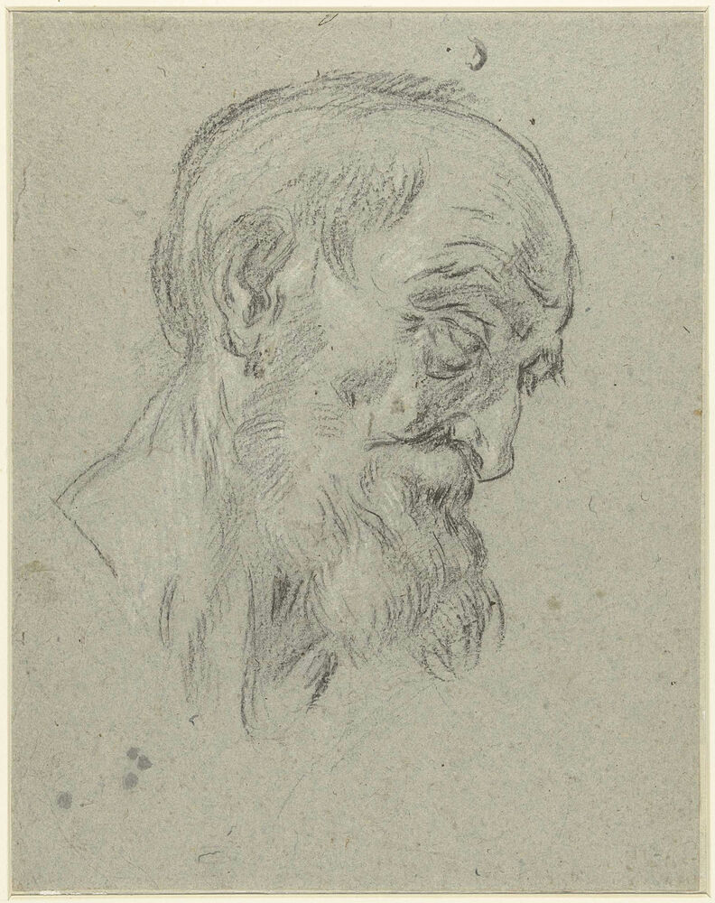 Hoofd van grijsaard, neerziend, en profil naar rechts