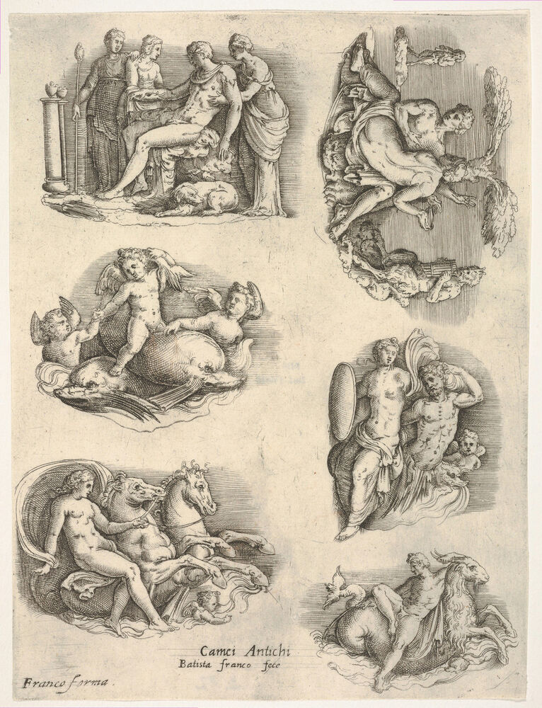 Six subjects after antique cameos: female figures tending to a seated male figure; putti and dolphins; female figure holding the reins of a pair of rearing horses; intertwined naked figures flanked by music-playing satyrs; triton with shield-bearing female figure; naked male figure seated on goat-headed sea creature