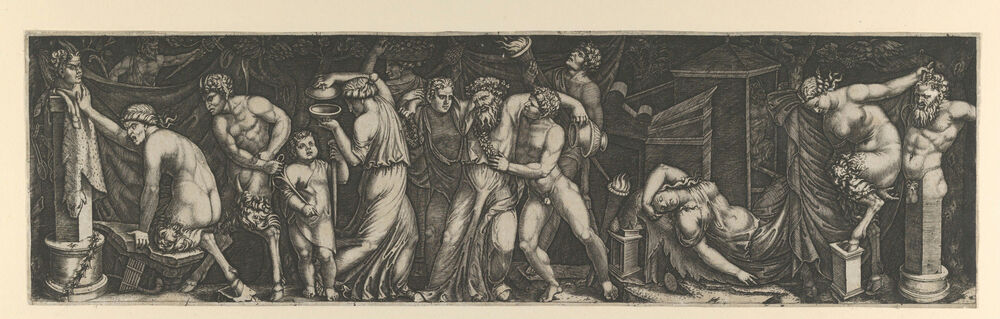 A Bacchanal, Silenus supported by two bacchants in the centre, at right a female satyr reclining on a bed and another pulling the horns on a statue of Priapus, various other figures fill the composition