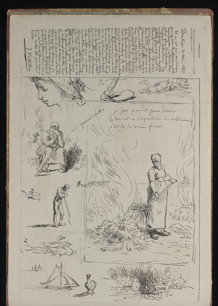 Facsimile reproductions of a letter and sketches by Jean-François Millet (rotated)