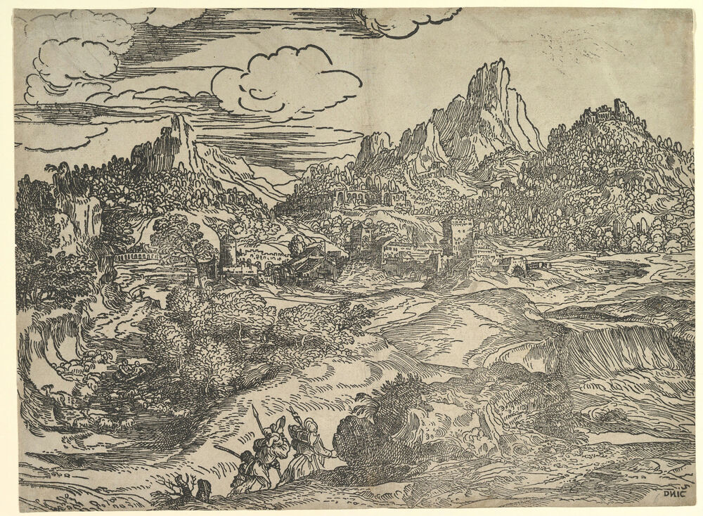 Landscape with family walking together in the foreground, at left two figures with herd of goats and sheep; a mill (?) and other buildings in the background