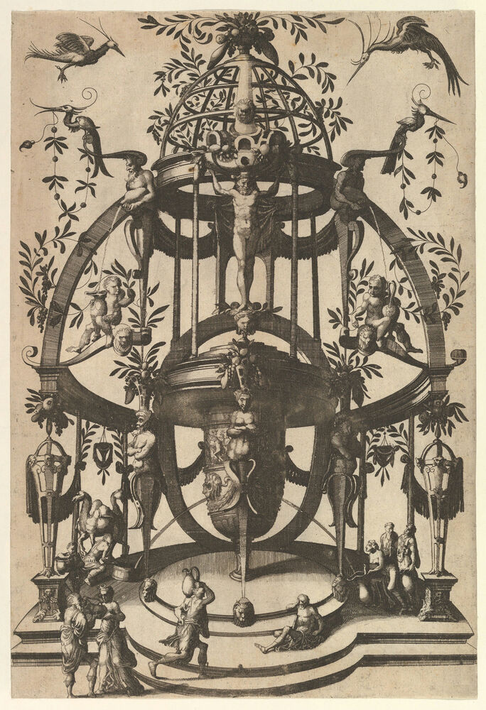 Vase Placed in Center of a Tempietto with Lattice, an Arch at the Top from Veelderleij niewe inventien van antijckesche sepultueren diemen nou zeere ghebruijkende is met noch zeer fraeije grotissen en compertimenten zeer beqwame voer beeltsniders antijcksniders schilders en all constenaers...Libro Secundo